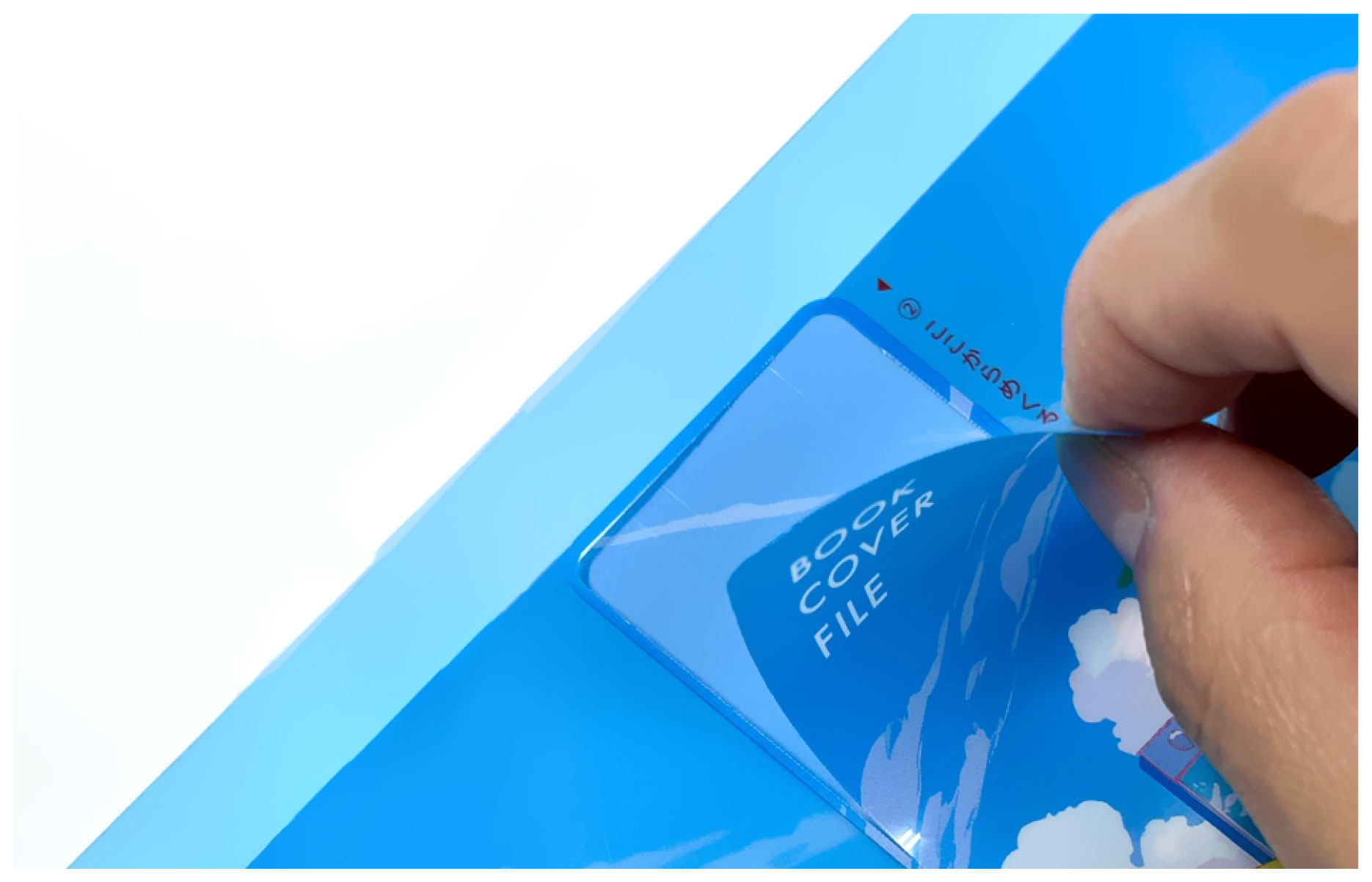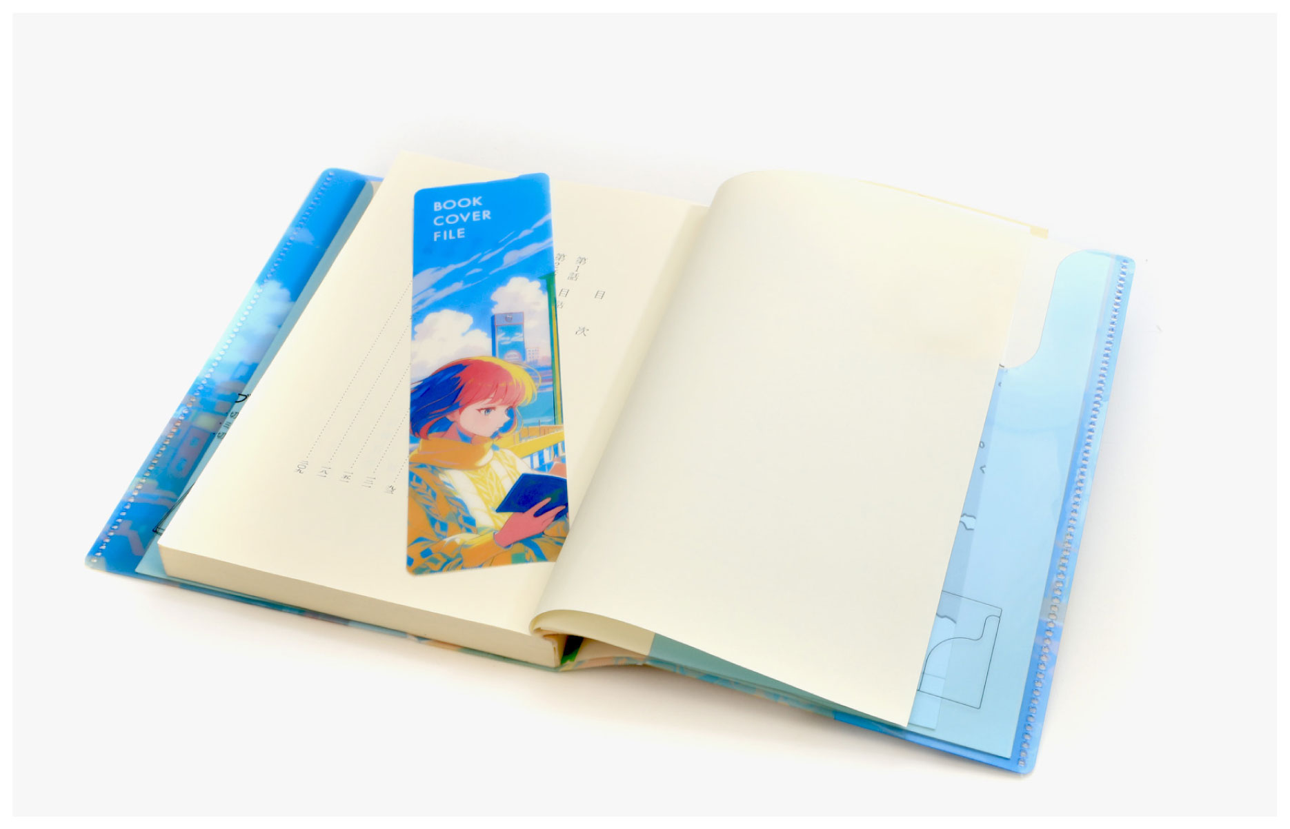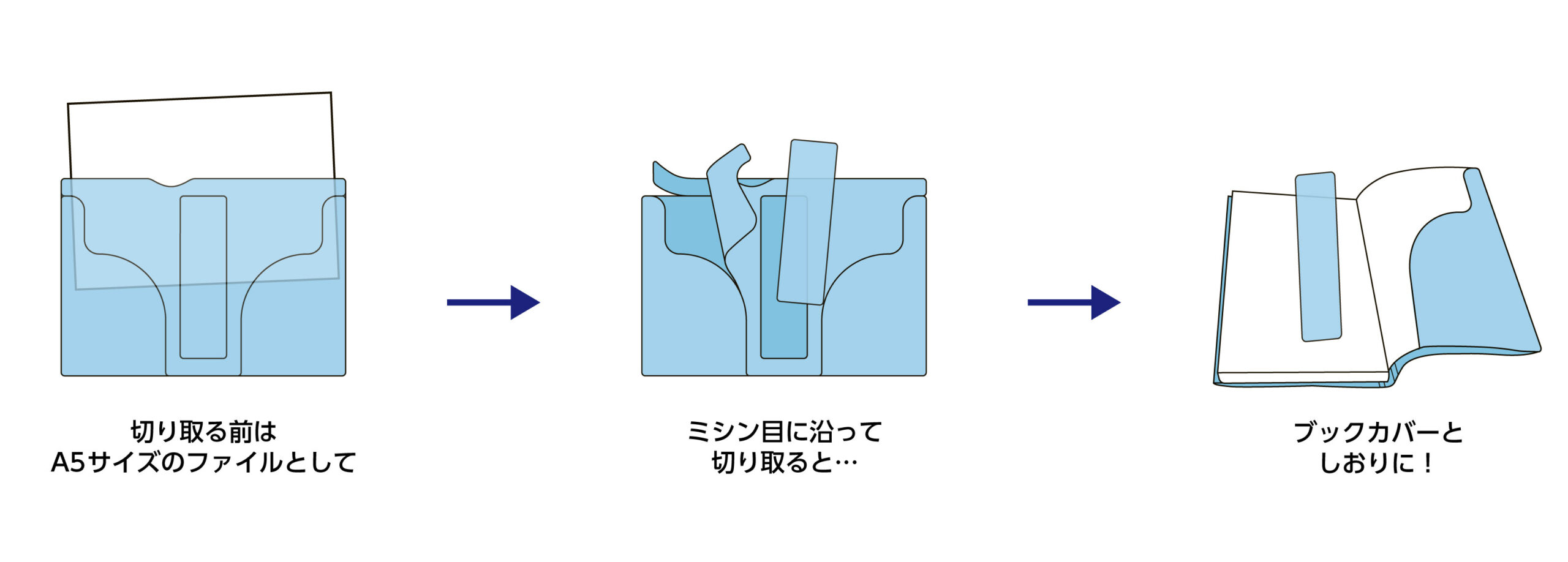 約A5(A4二つ折り)の書類を収納できる小型のクリアファイル。収納した書類の飛び出しが少ない2辺溶着。切り離して使える「しおり」も付いています。