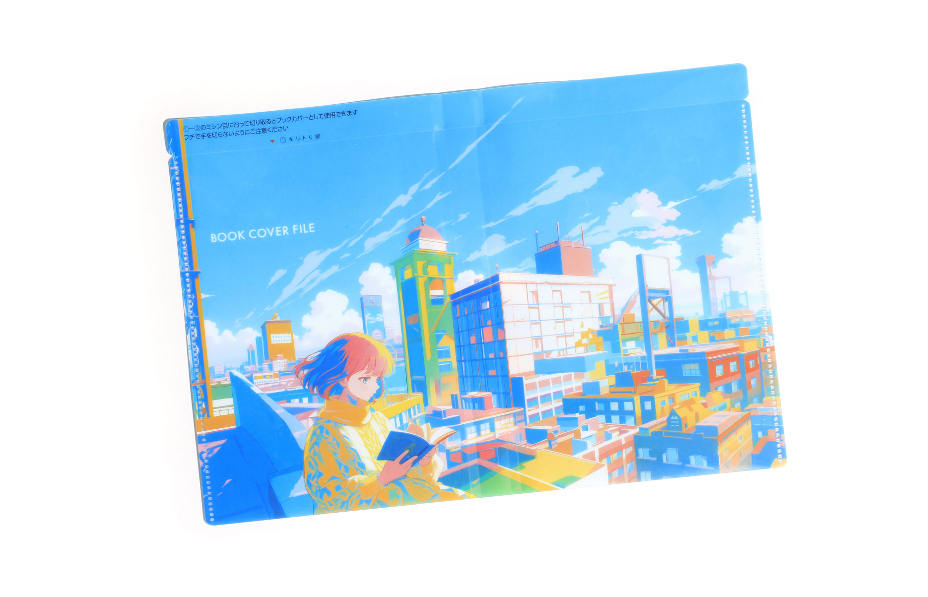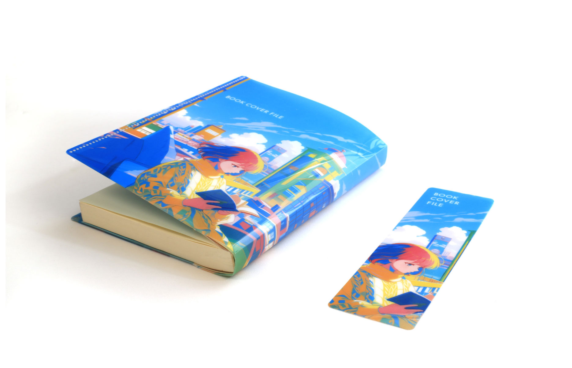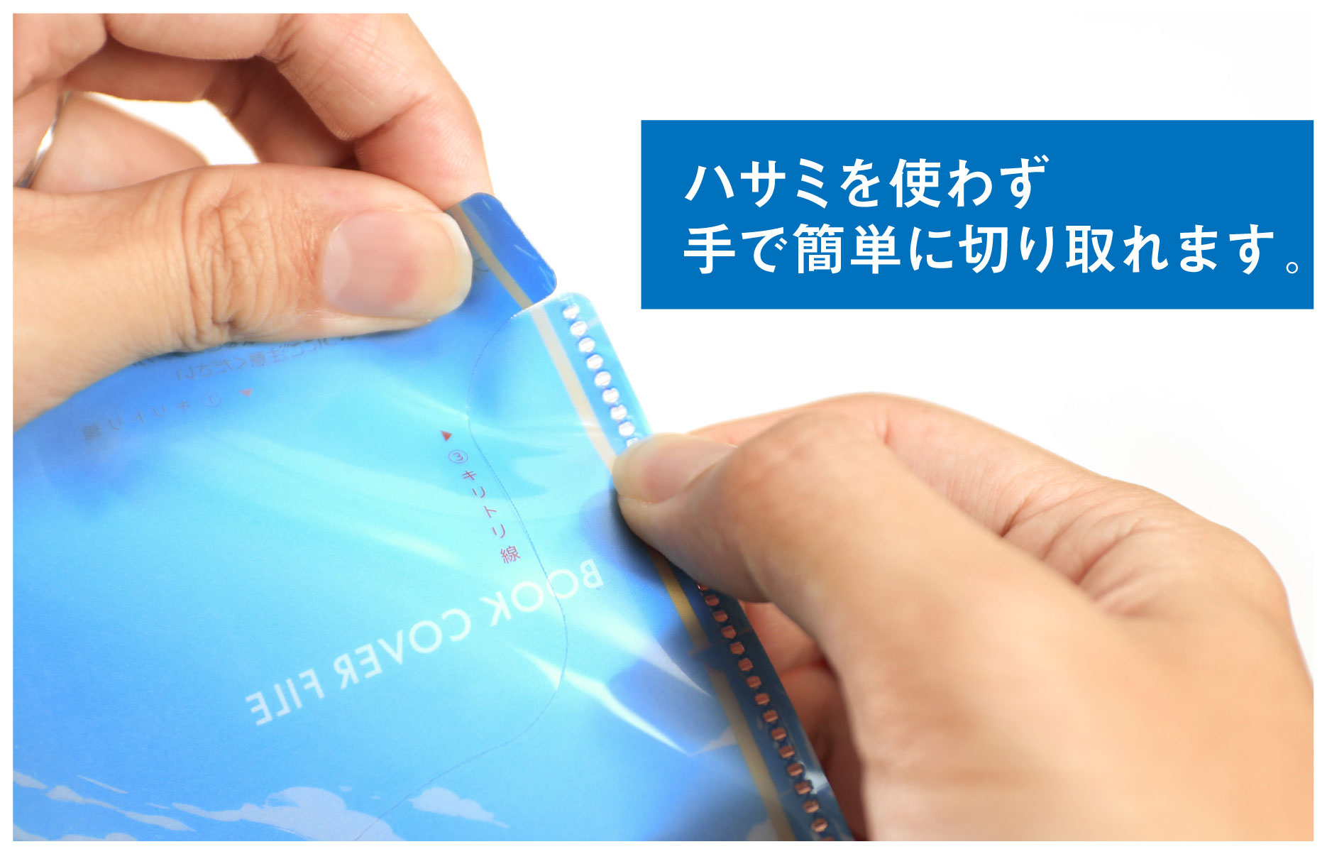 約A5(A4二つ折り)の書類を収納できる小型のクリアファイル。収納した書類の飛び出しが少ない2辺溶着。切り離して使える「しおり」も付いています。